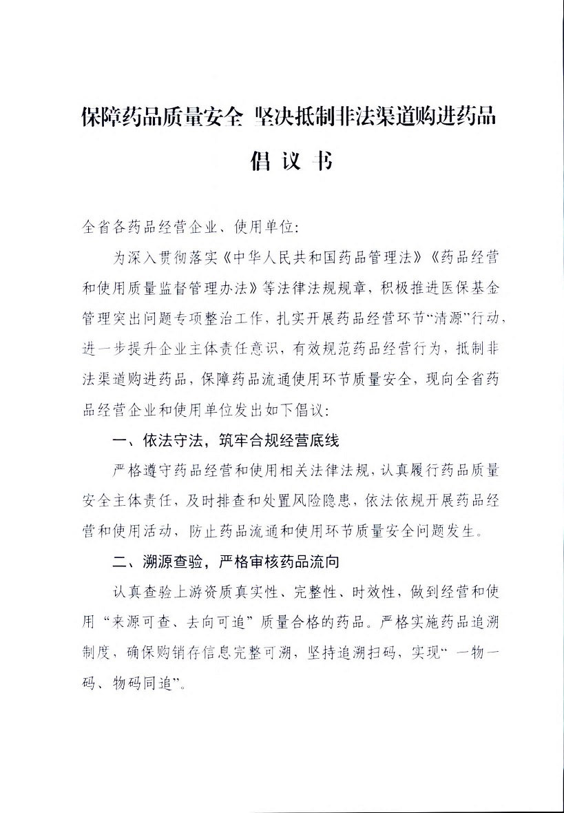 保障药品质量安全 坚决抵制非法渠道购进药品倡议书