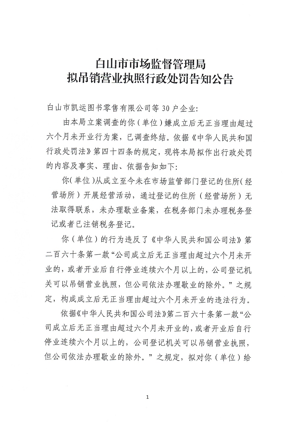 白山市市场监督管理局拟吊销营业执照行政处罚告知公告