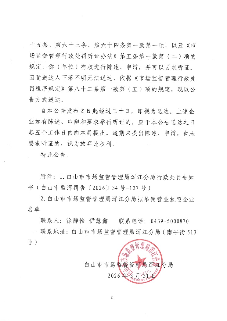 白山市市场监督管理局浑江分局拟吊销营业执照行政处罚告知公告